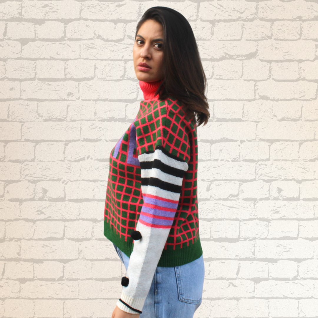 Jersey diseñado por MYKK en los talleres de Barcelona con telas y lana recicladas.