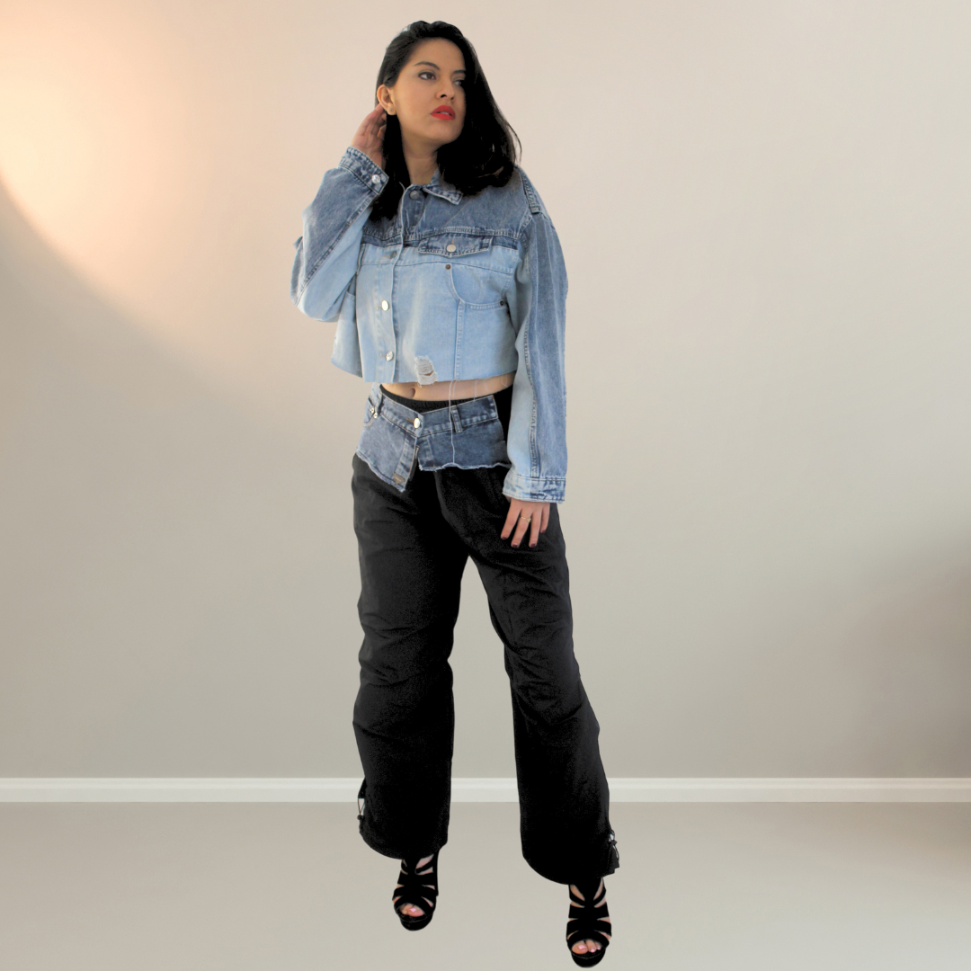 Un pantalón fusionado con la creatividad del diseñador Alberto Prades. Donde se inspiró en la comodidad y versatilidad de la prenda. Reciclando parte de un jean para darle un toque urbano.