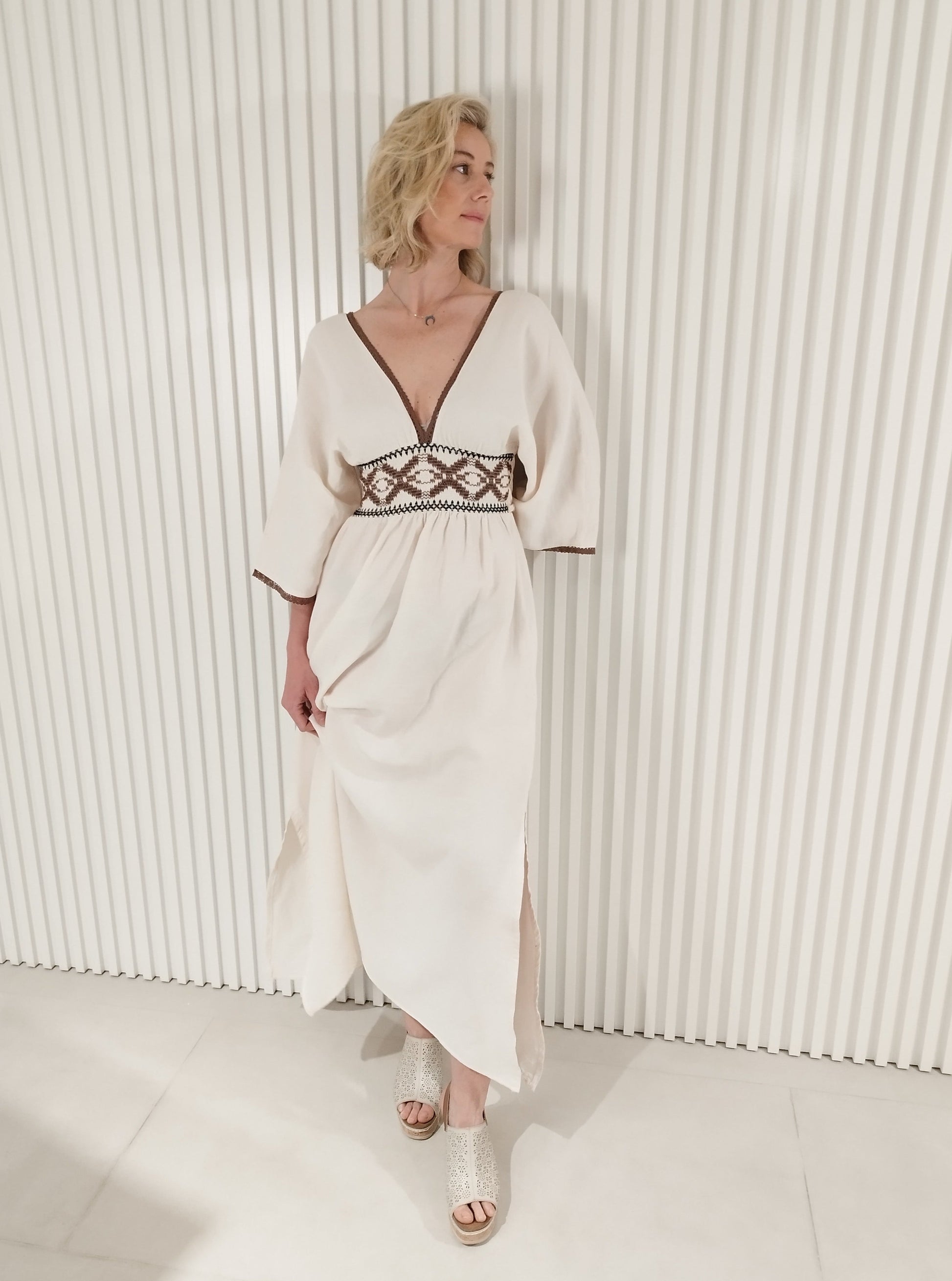 Confeccionado 100% en algodón orgánico y con bordados a mano, que ofrece elegancia y definición a la silueta. Resaltando la sostenibilidad y artesanía en cada detalle.